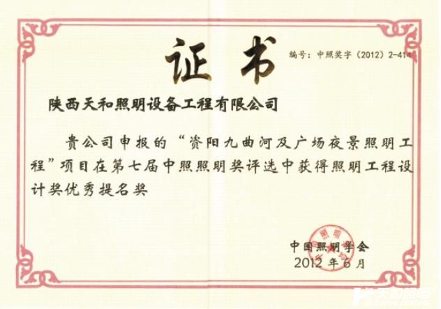 2012年榮獲中國照明學會第七屆中照照明獎“優秀提名獎”